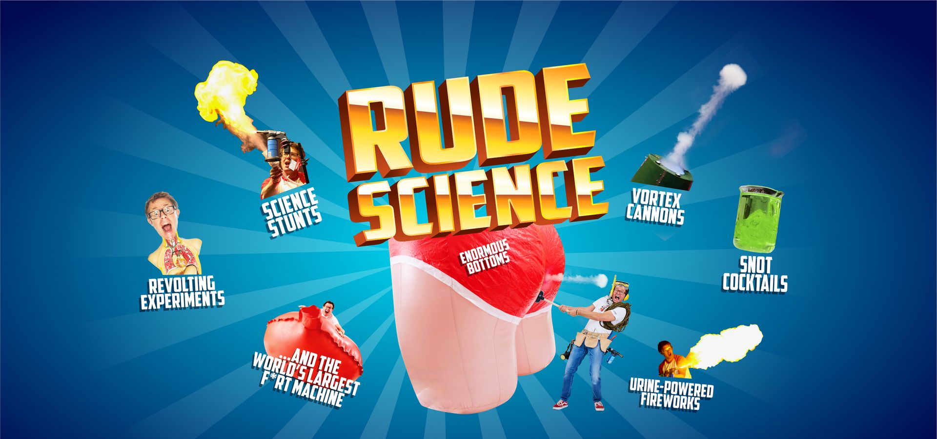 Expect enormous bottoms, f*rt machines, snot cocktails, vast whoopee cushions, pee-powered fireworks and ear-wax-oozing mannequins in this celebration of the fascinating bodily science essential to life. The show transforms complex biology, physics and chemistry into educational hilarity using Stef’s signature stunts and encyclopaedic science knowledge.